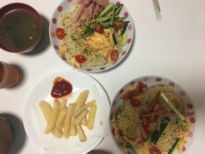 昨日の夕食は、具沢山の冷やし中華と、わかめスープ、フライドポテトでした!!