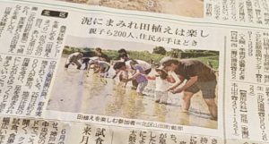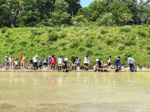 みんなで横一列に並んで、長ーい紐におじさんの掛け声に合わせて前に進みます。1回前に進むと、1列に右、左、真ん中の順番に 苗をぐっと深く押し込むのがコツのようです。私も何十年ぶりにしましたが、みんなと一緒に体験出来て楽しかったです!