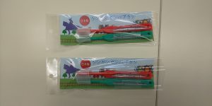 ・台紙に赤と緑の歯ブラシをセットする。