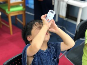 初めはトイレットペーパーの芯でお友達を覗いたり、メガホンのように口にあてたり、糸電話のようにしたり、いろんな発想で作る過程も楽しんでいました。